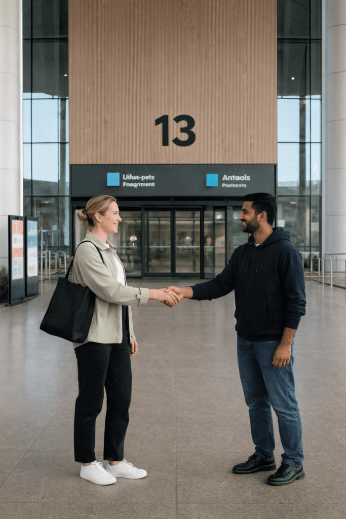 من المهم أن تلتقي بموظف الترحيب المخصص لك. أحيانًا، قد يضطر الموظف للابتعاد لدقائق قصيرة، سواء لاستخدام الحمام أو للرد على مكالمة عمل، لذا في حال لم يكن موجودًا في اللحظة الأولى، نرجو منك البقاء والانتظار أمام اللافتة. تأكد أنه سيعود إليك فورًا. نحن ملتزمون بأن يكون الاستقبال منظمًا وواضحًا، ولن نترك ضيفنا ينتظر دون متابعة.