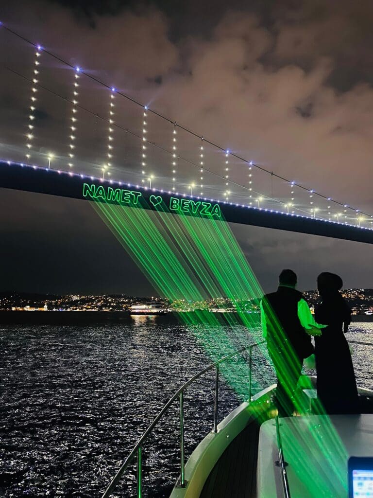 كما يمكن إضافة عرض ليزر على جسر البوسفور لإضفاء لمسة ساحرة على الأمسية، وهي تجربة مميزة خاصة في المناسبات الرومانسية، وتبلغ تكلفتها أيضًا 50 دولار.