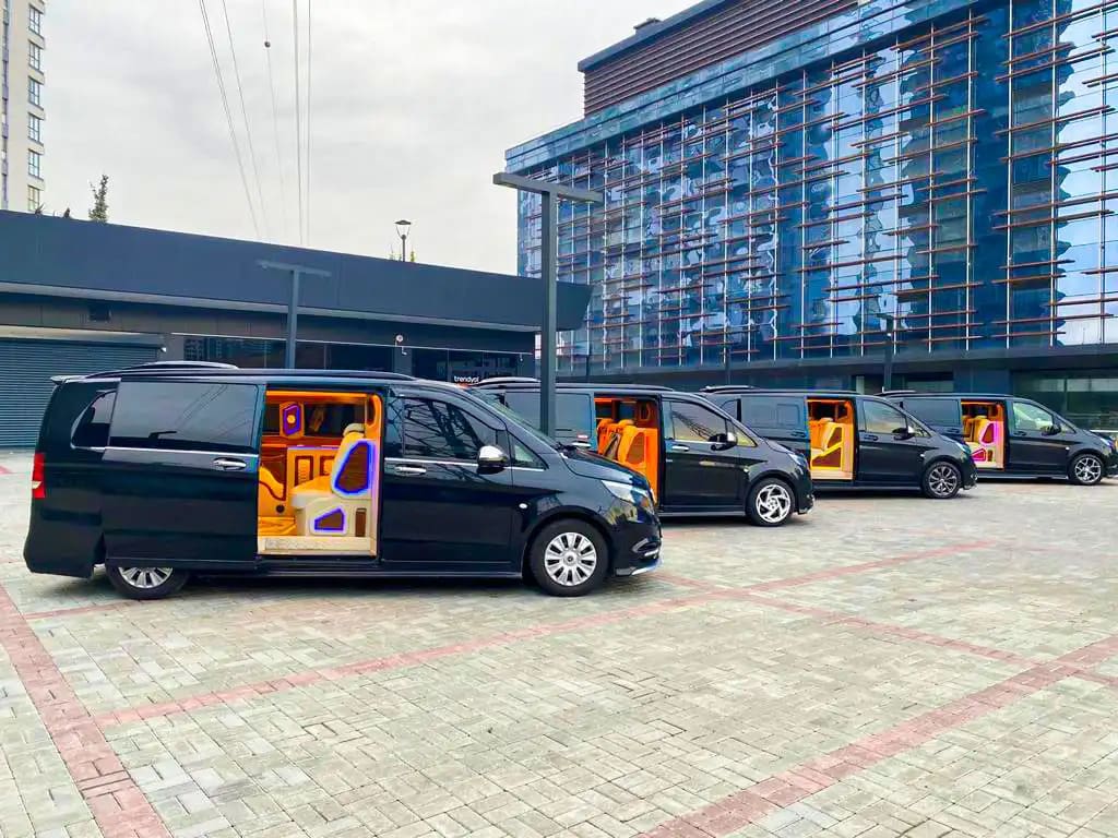 تُعتبر مرسيدس فان ميباخ الخيار الأكثر فخامة ضمن خدماتنا حيث توفّر تجربة راقية تجمع بين الخصوصية العالية والمقصورة المجهزة بمقاعد جلدية مريحة، ومساحات واسعة للأرجل، إلى جانب تجهيزات إضافية مثل الشاشات وخدمة الإنترنت. يُنصح بهذا الخيار لكبار الشخصيات، ورجال الأعمال، أو المسافرين الباحثين عن أقصى درجات الرفاهية والهدوء أثناء الانتقال من أو إلى المطار.